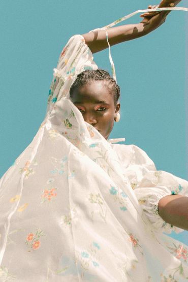 Model in vibrant orange dress with feathered sleeves in a blurred motion outdoors.