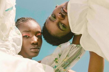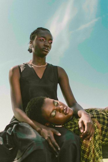 Three women in vibrant, colorful dresses posing dynamically against the sky.
